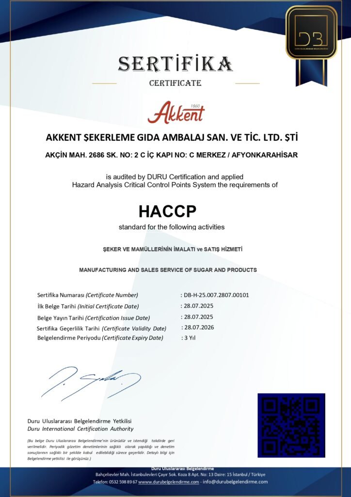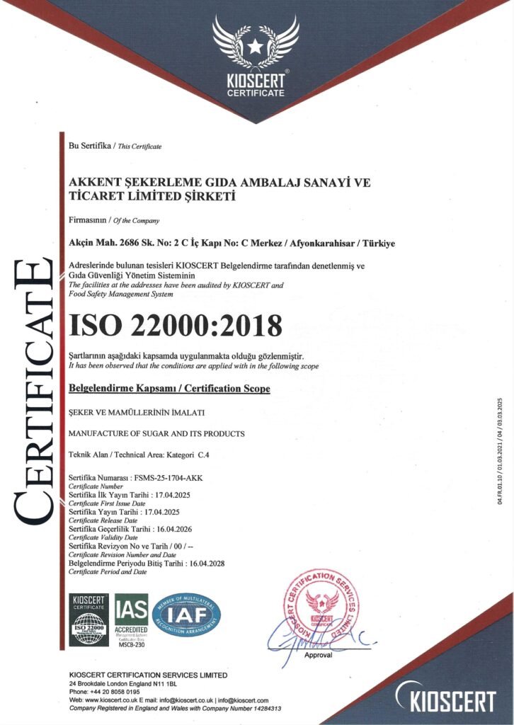 Akkent Lokum olarak üretim süreçlerimizde hijyen, gıda güvenliği ve kalite standartlarına en üst düzeyde önem veriyoruz. Sahip olduğumuz ulusal ve uluslararası kalite belgeleri, bu konudaki titizliğimizin ve sorumluluğumuzun bir göstergesidir.
